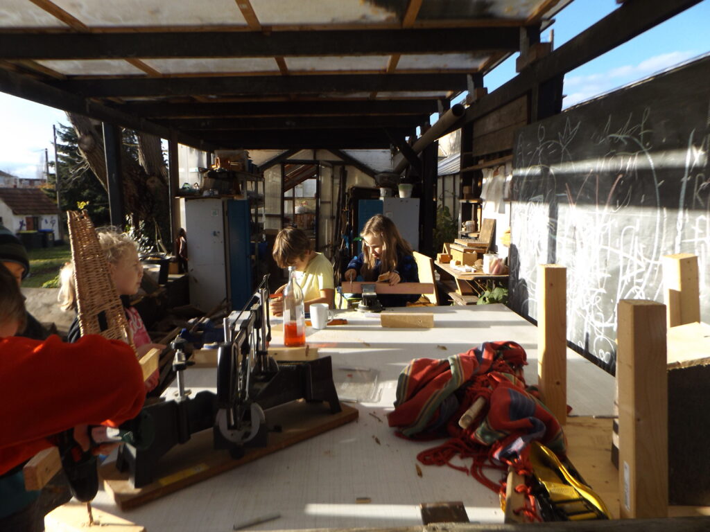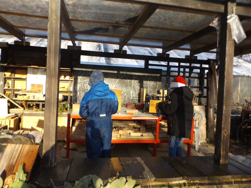 Mit den Erfahrungen aus unserer Holzwerkstatt haben die Kinder im Außenbereich an ihrer Hüte arbeiten können.